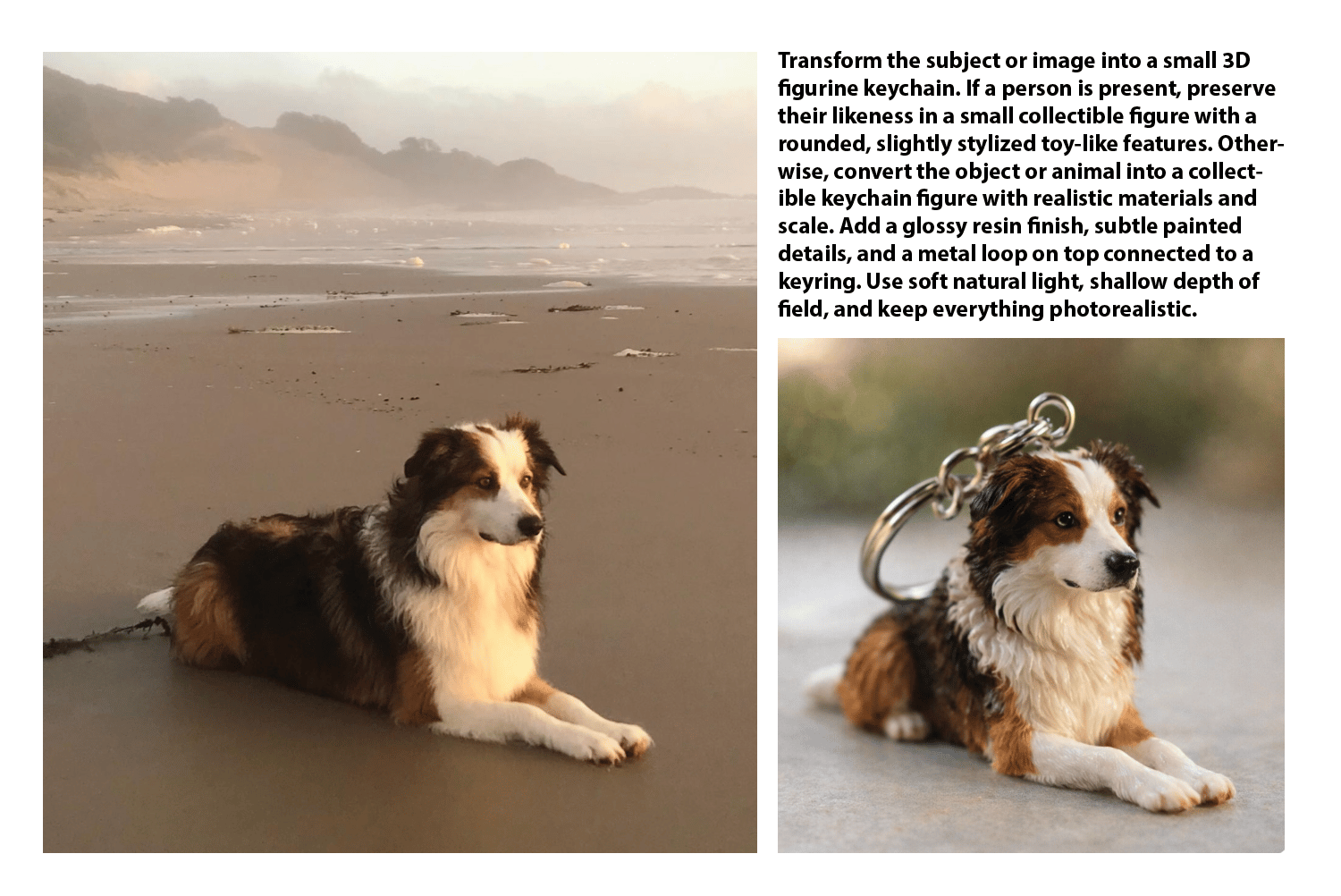 OpenAI also introduced a dedicated Images workspace. The new tab functions as a lightweight creative studio with preset styles, prompt templates, and inspiration flows. Many transformations work without typed prompts, lowering friction for non technical users. I turned a picture of my parents’ dog, Louie, into a keychain, using one of these.